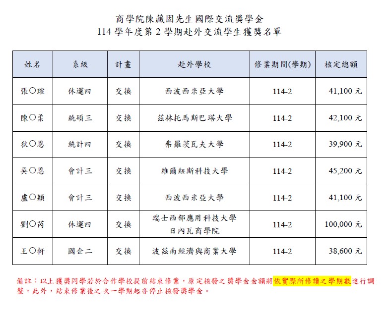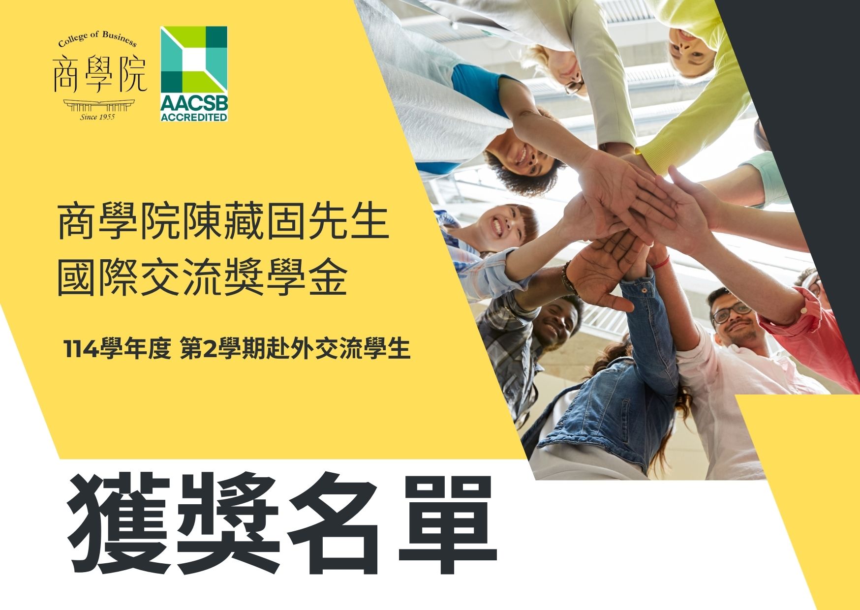 商學院陳藏固先生國際交流獎學金114學年度第2學期赴外交流獲獎名單