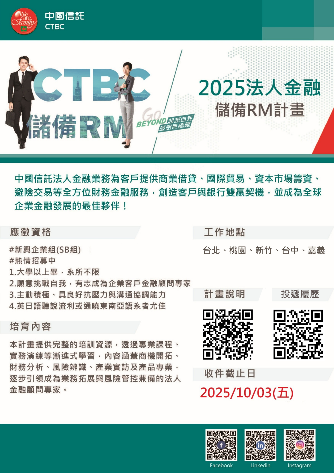 即日起收件至10/3(五)23:59截止,歡迎至中國信託人才招募網投遞履歷!